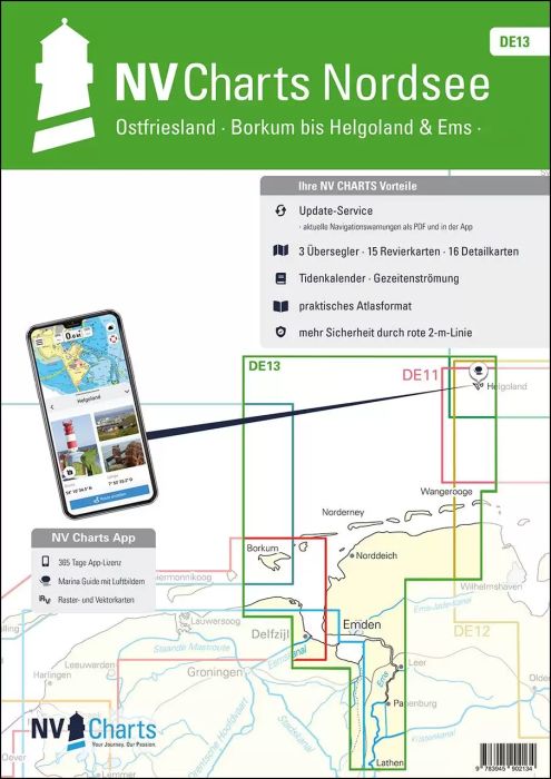Die Ostfriesischen Inseln Borkum, Juist, Norderney, Baltrum, Langeoog, Spiekeroog und Wangerooge sind ein ebenso reizvolles wie anspruchsvolles Revier. Scheinbar unendliche Weite, die frische Brise und lange Strände prägen die Inselgruppe vor der Küste Niedersachsens, hier gibt es für Jung und Alt viel zu entdecken. Die Inseln sind unterschiedlich in ihrer Größe und jede hat ihren eigenen Charakter, landschaftlich aber gleichen sie sich: Sandstrand zur offenen Meerseite, Dünen in der Mitte und Marschland zur Landseite, wo sich das Wattenmeer findet. Grundsätzlich verfügt das strömungsreiche Tidengewässer über ausreichend gut ausgebaute Marinas und Versorgungsmöglichkeiten für Gäste. Mit den aktuellen Seekarten des Kartensatzes DE 13 sind Sie optimal für die navigatorischen Herausforderungen an der deutschen Nordseeküste gerüstet und Tide und Strömungsinformationen sind in dem handlichen Atlas ebenso enthalten wie der Zugang zur nv charts App.Die Karten für das Seegebiet Ostfriesland - Borkum bis Helgoland & Ems sind die für die Sportschifffahrt optimierte und professionelle Kartographie in der Nordsee. Sie beinhalten alle für die Navigation in den schwierigen Gewässern der Deutschen Bucht notwendigen Informationen und zusätzliche Hafenpläne und Details für Ansteuerungen und Passagen in den Gewässern. Der Kartensatz beinhalten auch die aktuellen Tidenangaben sowie Strömungsdaten, die sich auf die Tiden-Diamanten in den Karten beziehen.